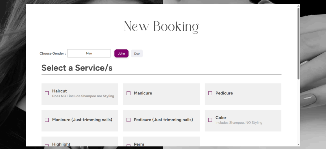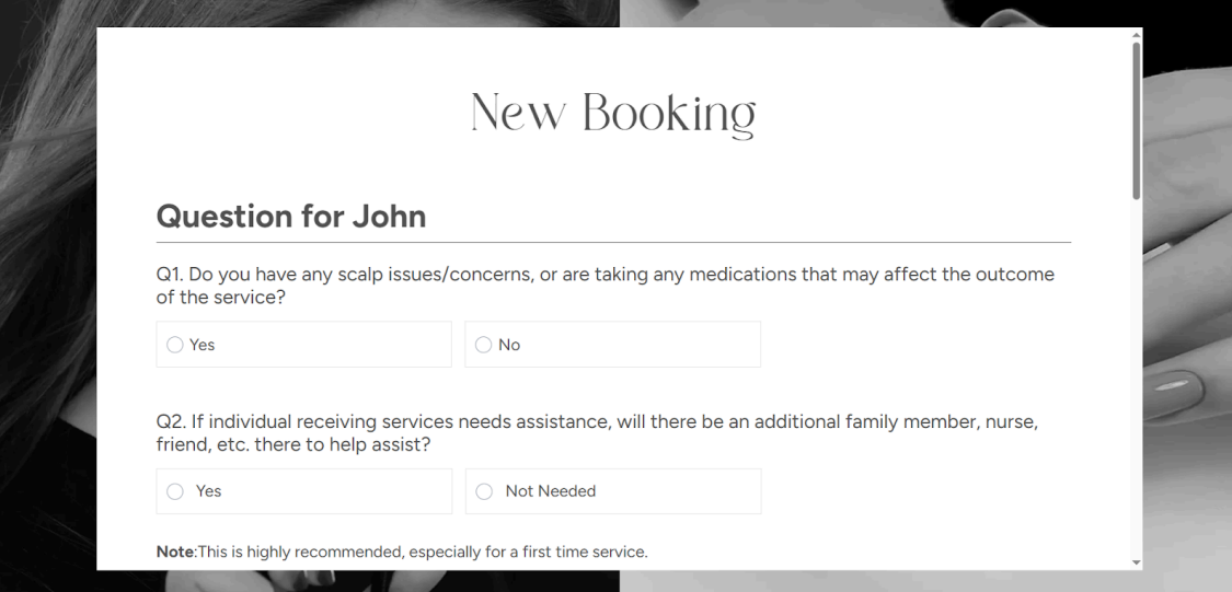 5. After selecting a stylist, the customer must answer questions for each person based on the chosen services, as well as provide information about their location