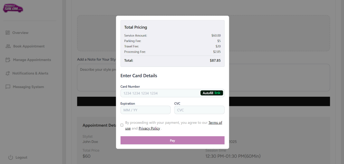 only be processed once a stylist accepts the appointment. If no stylist accepts, the appointment will be automatically cancelled after 8 hours.