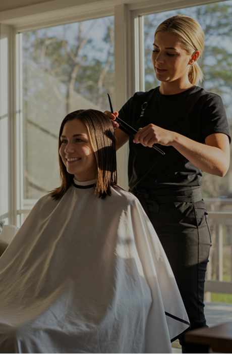 Woman’s haircut removes length and/or weight, also creating texture or volume in the hair using professional tools.