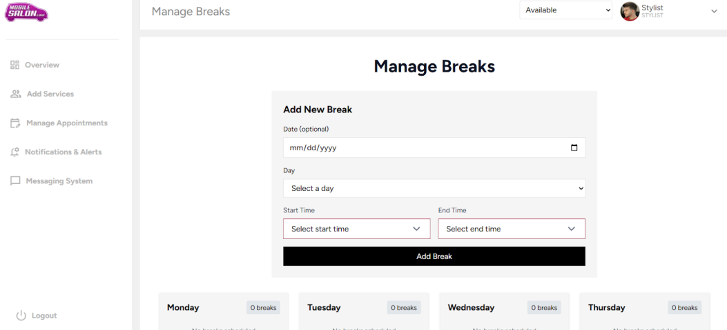 2. They can add recurring breaks (E.G., every Friday from 2 PM to 3 PM) or breaks on specific dates, during which they will not receive any new appointments.
