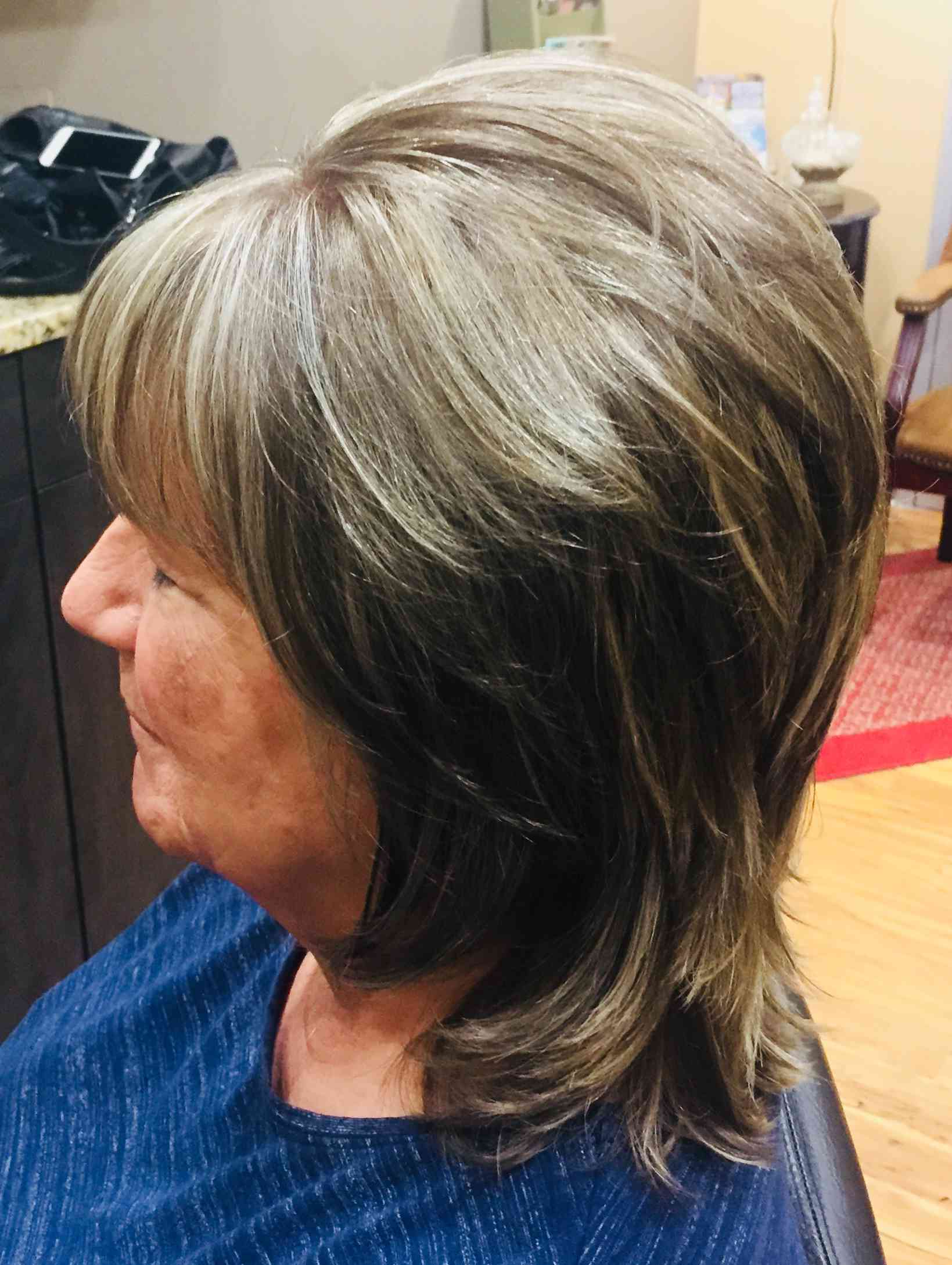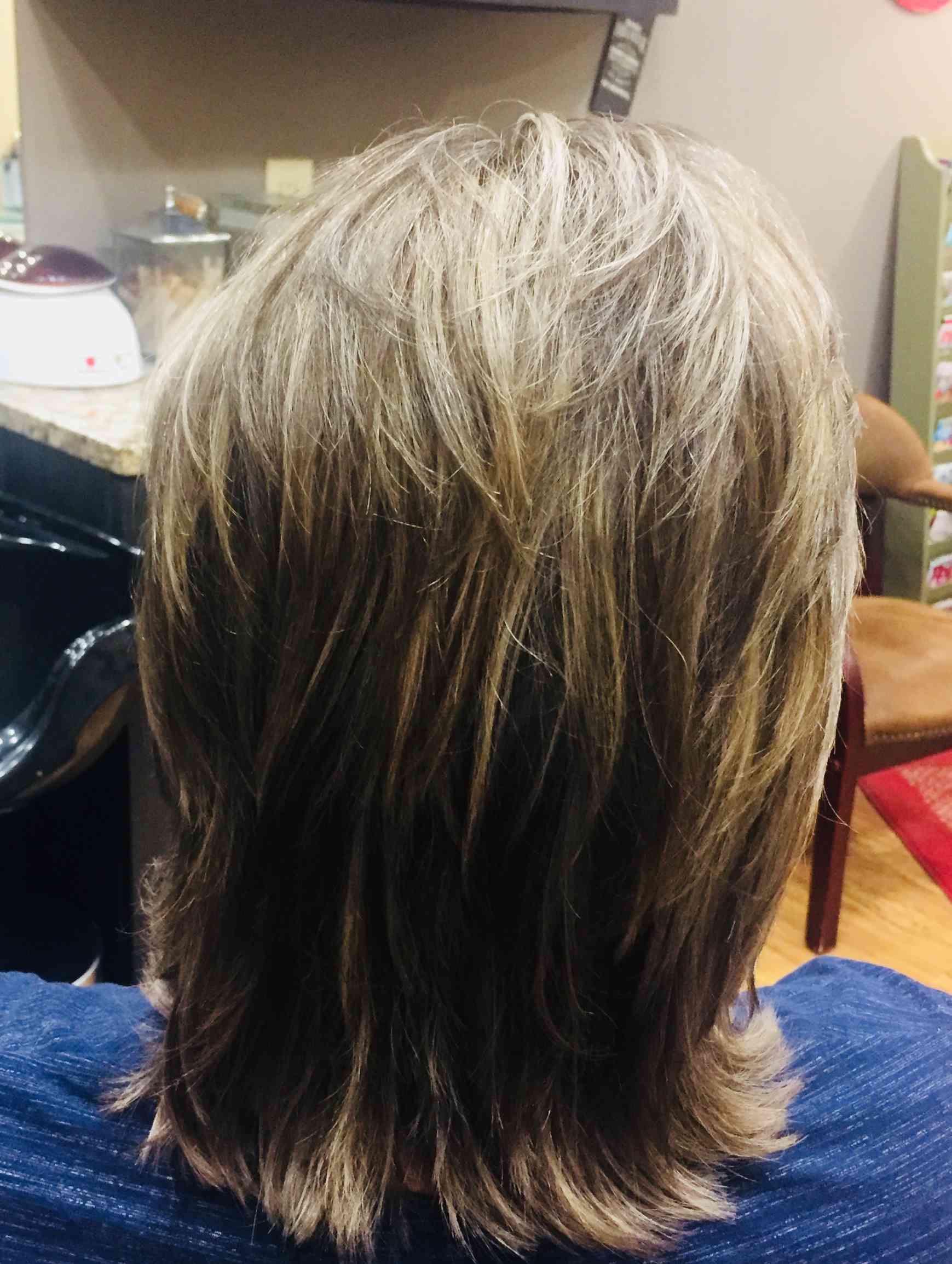 Bridget Redifer, Apple Valley, MN. We did a paint between with highlights. Base color is a medium neutral brown with blonde highlights. Gave her a slight trim with many layers. Styled with Lanza Thickening Treatment Spray in her root area, and applied Biosilk Silk Therapy to her midshaft and ends. Roundbrushed with a medium size roundbrush, and finished with a touch of Chi Finishing Spray.