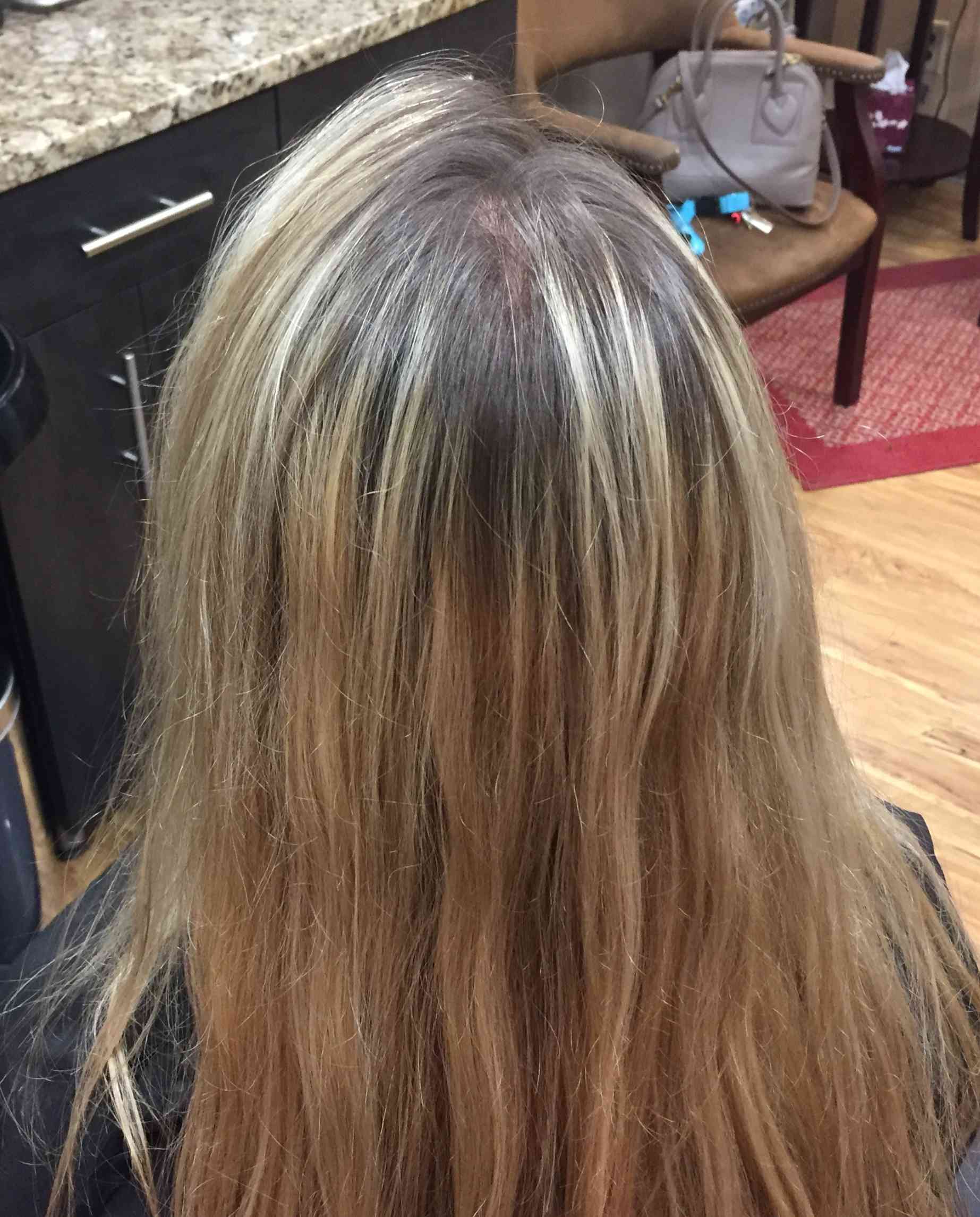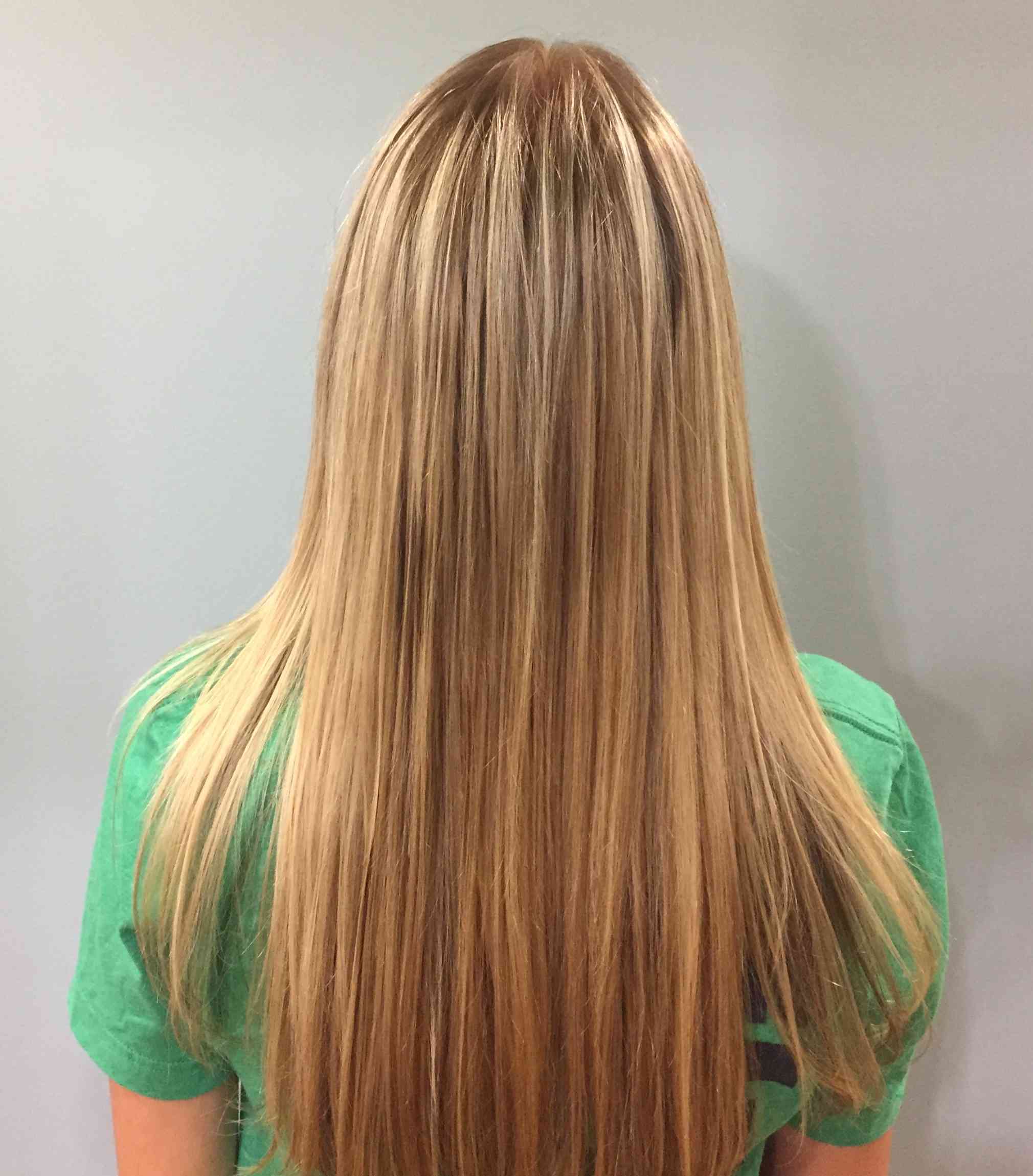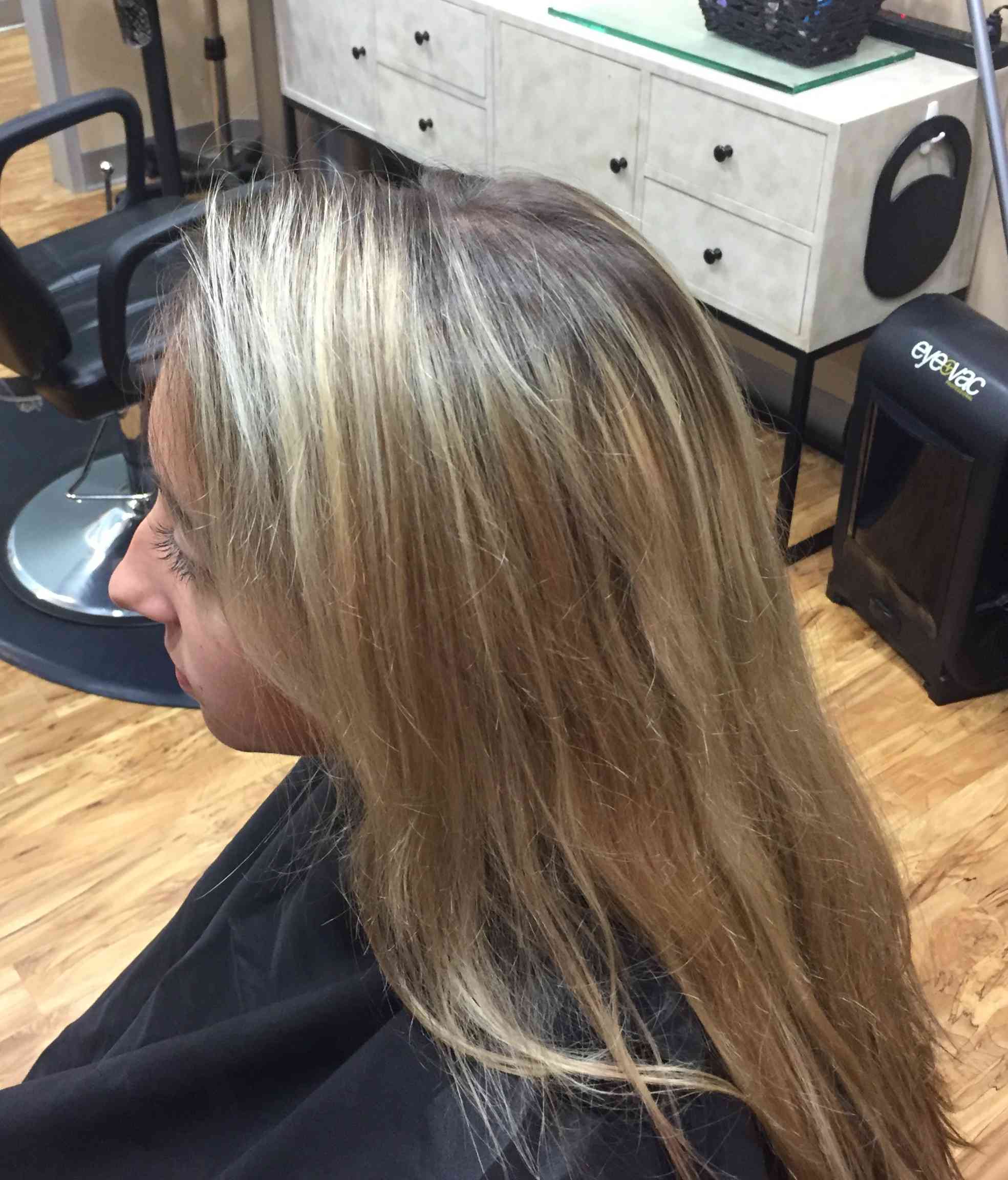 Stefanie Belew, Apple Valley, MN. We softened Stefanie's natural haircolor to blend in with her previously lightened highlights. Used a medium blonde color with 30 volume for about 15 minutes. Used Lanza Silver Brightening Shampoo after rinsing to give her a little more even true tone. Styled with Lanza Thickening Treatment Spray, and applied Biosilk Silk Therapy on her midshaft to ends. Round brushed with a large brush, and finished with a little more Biosilk Silk Therapy to her very ends. (Before pictures on the bottom)