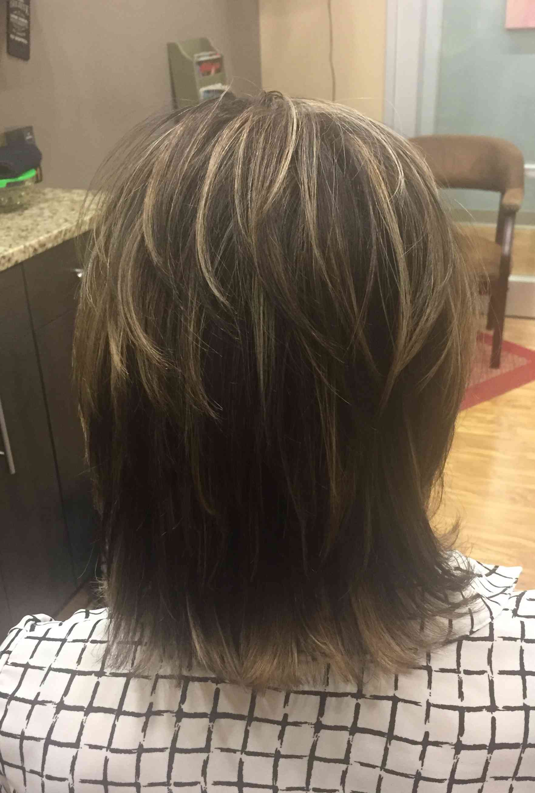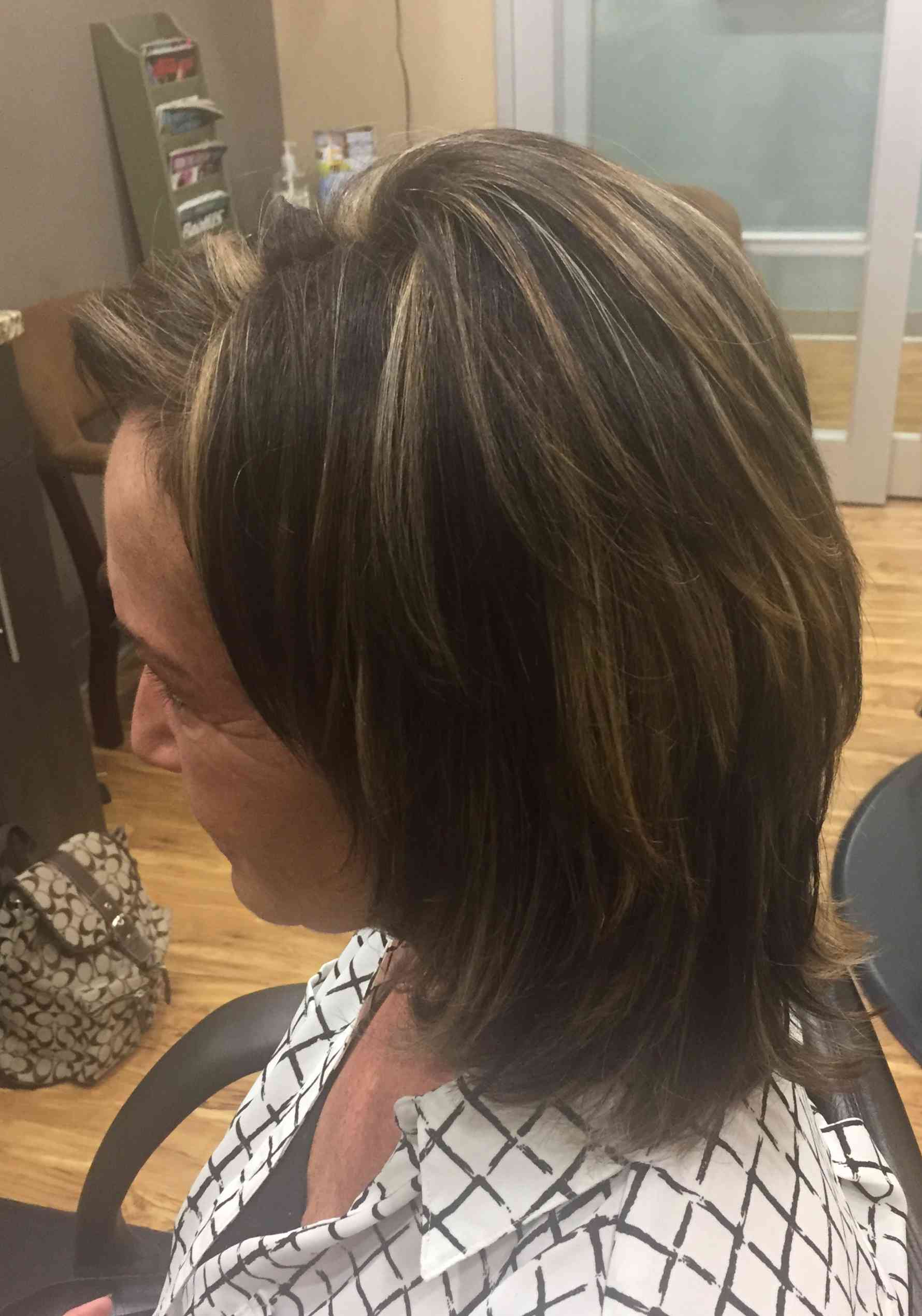 Happy client, Lisa Grunst, Chaska, MN. Did an all over dark chocolate brown base and added some golden highlights throughout. We also trimmed her hair as she is trying to grow her length, and waxed her eyebrows. Styled with Lanza Thickening Treatment Spray in root area and used Biosilk Silk Therapy on her ends. Used medium size round brush while blowdrying.