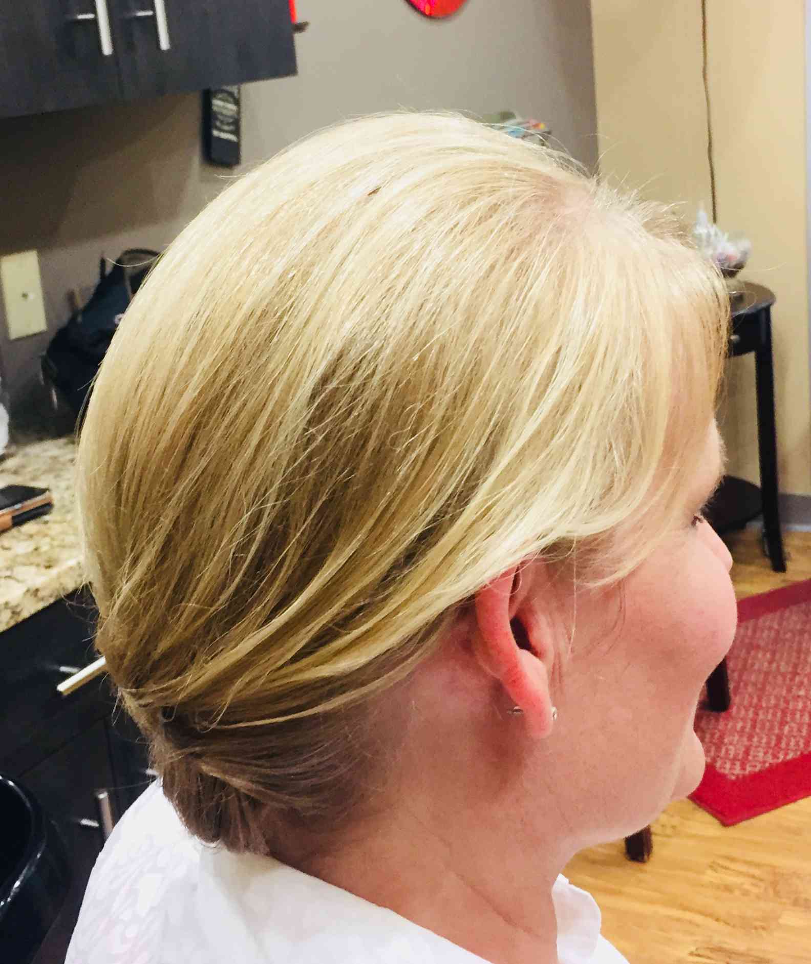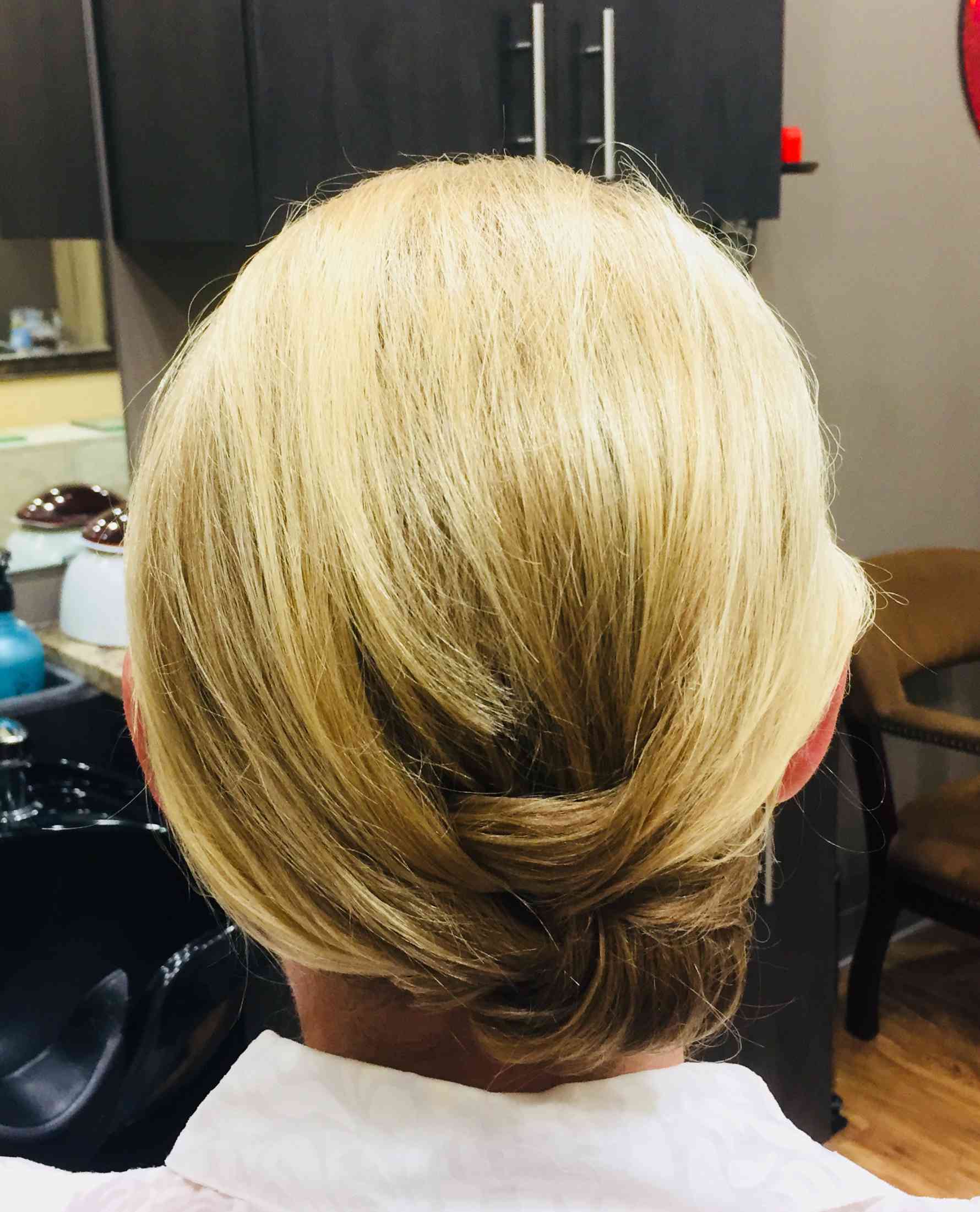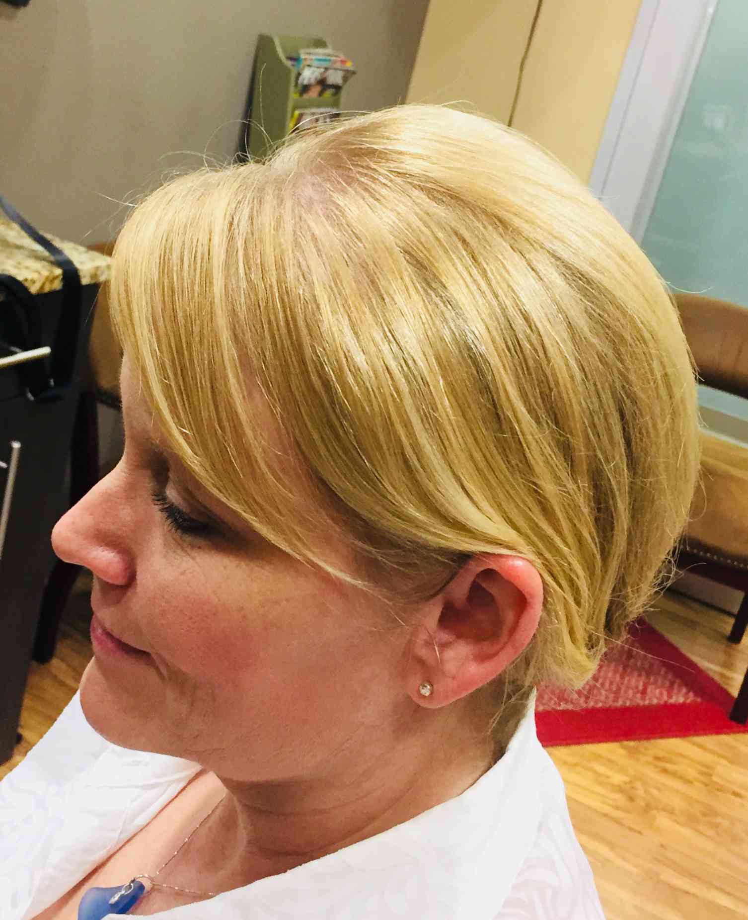 Rochelle Perry, Apple Valley, MN. We did a simple and elegant trial updo on the Mother of the Bride. Wedding will be in Germany! We backcombed her top, crown, and sides. Also, slightly backcombed Rochelle's bangs, and lifted with the tail of the backcomb brush. Then, did a low, simple three strand braid. Pulled strands of the braid out a little to give the hair a little more thickness. After securing braid with a plastic hair binder, tucked and rolled the braid under, and bobby pinned. Finished with Neuma, In Control Medium Hairspray, and Chi Shine Fusion for some extra shine:)