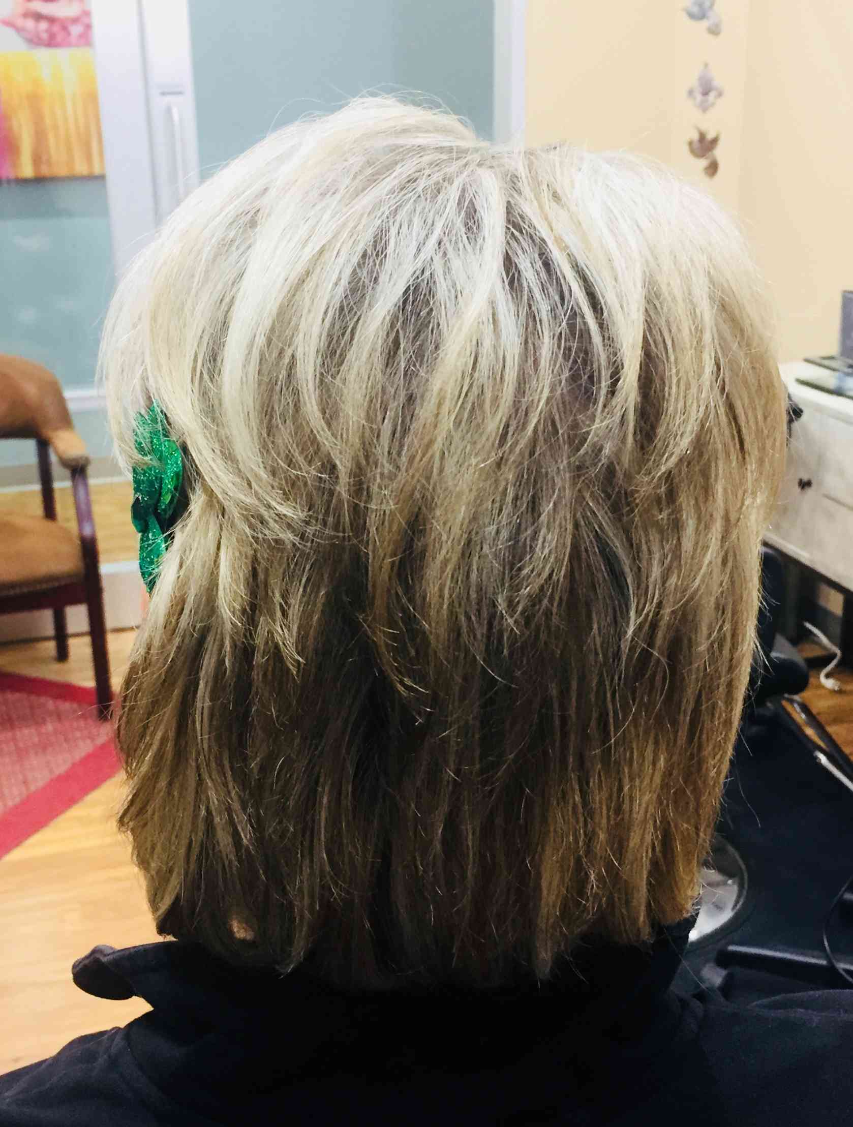 Patty Severson, Apple Valley, MN. We touched up her pale blonde highlights with Blonde Dimensions, and trimmed her hair. Styled with Lanza Thickening Treatment Spray in her roots, and Biosilk Silk Therapy on her midshaft to ends. Blow-dried with a small roundbrush, and used Redken Rough Paste through her ends to give her some texture and a piecey look. Added a cute shamrock for St. Patty's Day festivities:-)