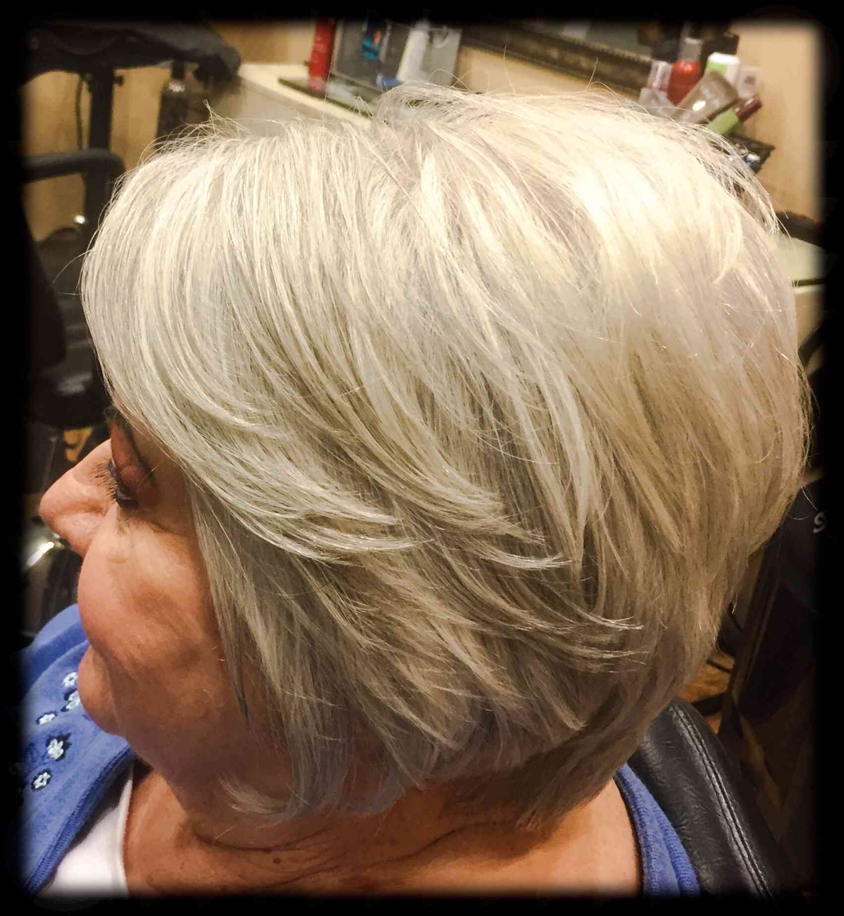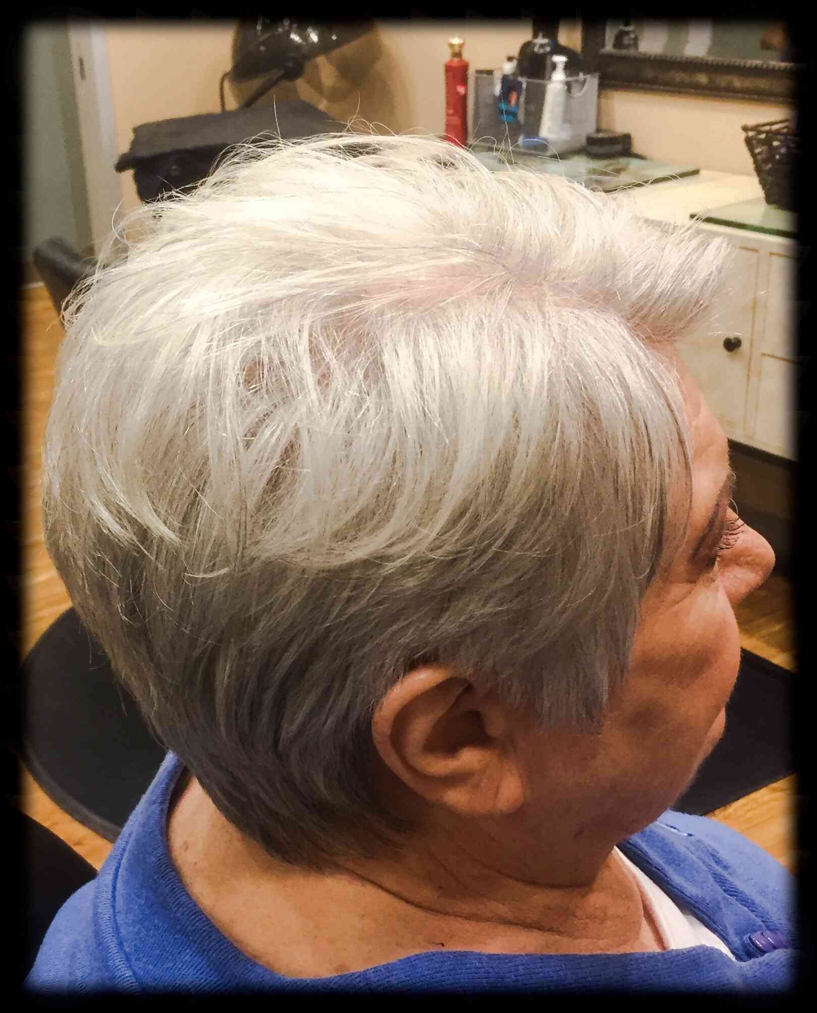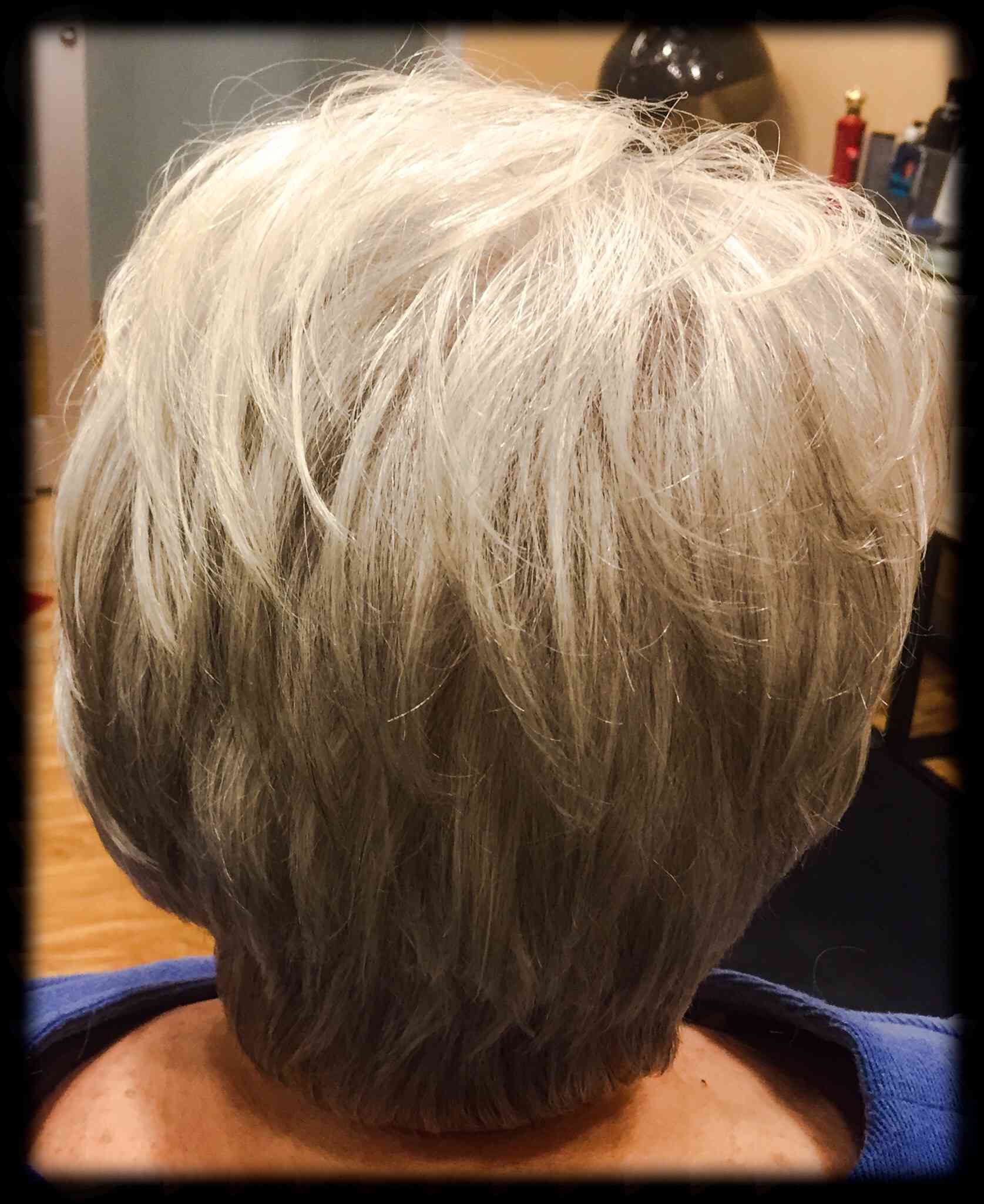 Kari Pflughsaupt, Apple Valley, MN. We did a short asymmetrical haircut, with chin length on the left side, and up over the ear on the right side. We used a feather razor to give her an edgy cut. Styled with Lanza Thickening Treatment Spray, and Neuma Smoothing Crème on her midshaft to ends. Blow dried with a medium size round brush, and finished with Redken Rough paste through her ends to give her a piecy look. Also, added a touch of shine with Chi Shine Fusion.