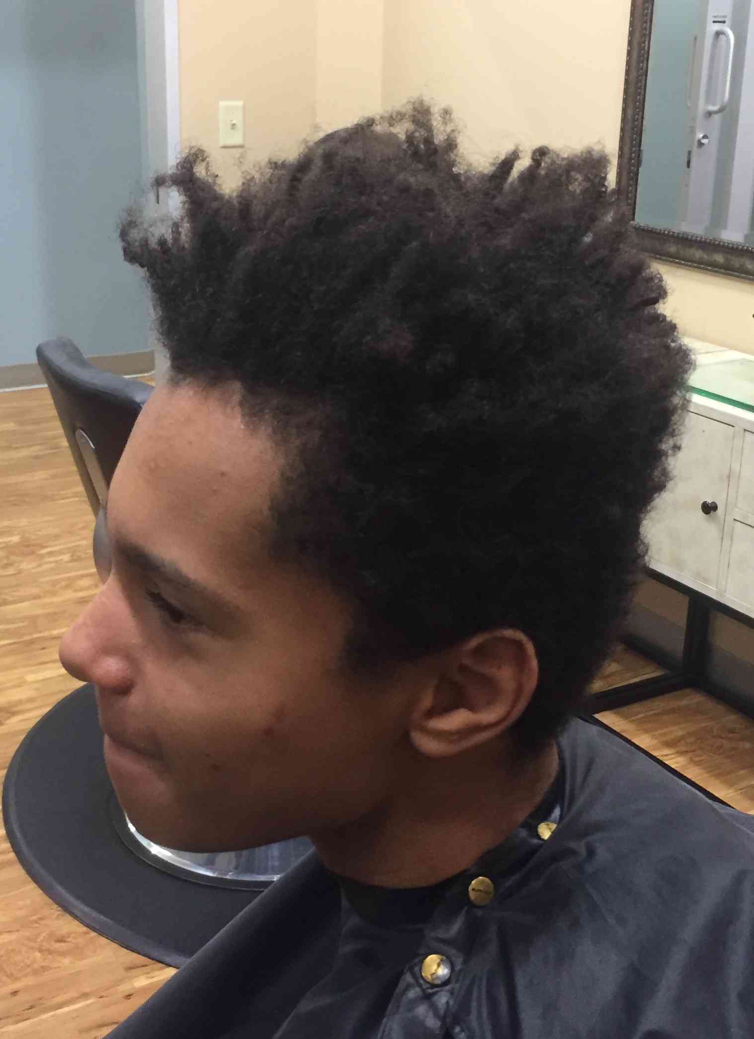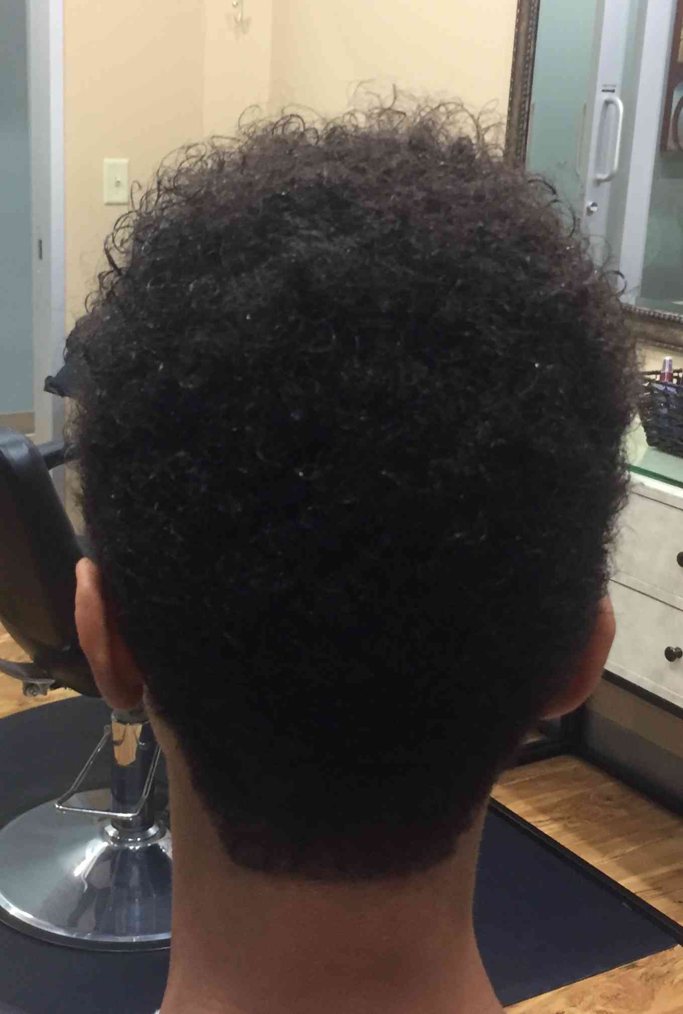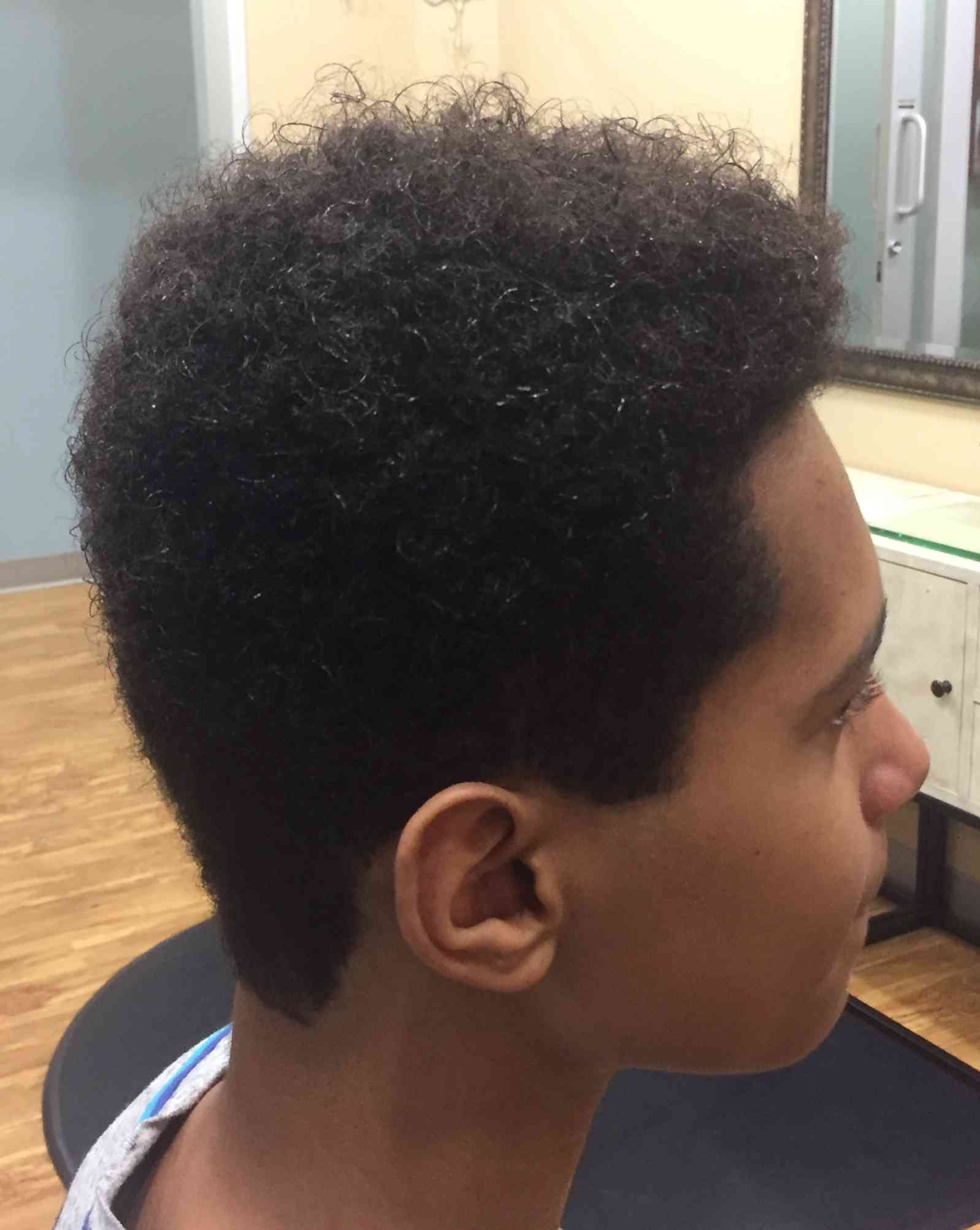 Kennedy Gibbs, Farmington, MN. Used clipper with guard up sides and back, and scissor cut the top. Then, blended the sides and top with clipper over comb technique. Also used clipper over comb technique on the top to give more of a finished look. Edged around ears and nape with trimmer. (Before pic on bottom)